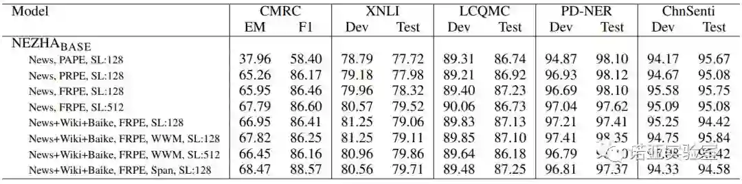 本工作还对NEZHA模型进行了剥离式研究(Ablation Study),着重研究了以下几个训练因素对模型效果的影响: