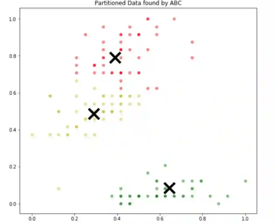 如何修改原始的 ABC 算法使其得以执行聚类任务?实际上,此处 ABC 算法没作任何改动。唯一要做的就是将聚类问题转化为优化问题。如何做到这一点?