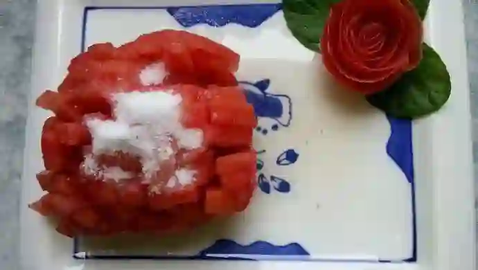 以前去饭馆吃饭,常在菜单上看到这道菜,每次想点都被父母制止。后来等自己参加工作,终于解开了存在多年的谜题,原来就是糖拌西红柿……难怪父母不让点,因为做起来太简单了,到饭馆吃确实浪费。不过菜名很是形象,鲜红的西红柿很像火,摞起来就是火山,白糖洒在顶上犹如下了雪一样。