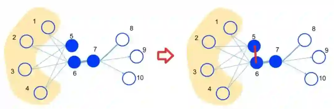 引用论文LINE: Large-scale Information Network Embedding 中的一张图为例,假设下图是一个好友网络,可以看出,用户 5 和用户 6 有很大的相似性(共享了很多好友),但是目前他们并不是好友。使用图自编码器的复原结果(右图),我们可以获取他们之间隐含的相似关系(红色的边):