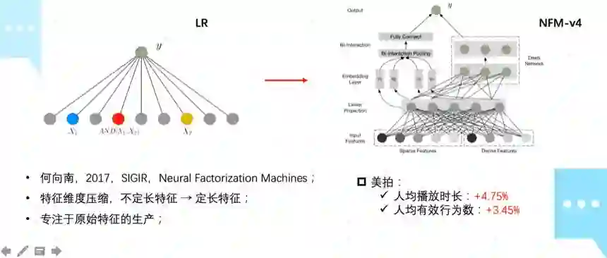 但是,将几十万维的高维空间直接压缩到几百维,存在一定的信息损失,因此,在 NFM-v4 的基础上,我们通过将部分高维 id 特征单独建模,比较好的解决了这个问题,在业务指标上,也有不错的效果提升,美拍的人均播放时长增加了 4.75%,人均有效行为数增加了 3.45%。
