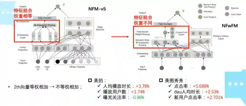 不过,NFM 存在的一个问题是,bi-interaction pooling 认为特征二阶交叉的权重是相等的,这种假设在多数场景下并不符合数据的真实分布。因此,在 NFM 的基础上,我们提出了 Neural Field weighted Factorization Machines(NFwFM)模型,通过引入一个权重向量,来建模二阶交叉特征的权重。通过二阶向量不等权相加,业务指标整体提升较为明显。其中美拍人均播放时长增加 3.78%,播放用户数增加 1.74%,美图秀秀点击率提升了 5.689%,人均使用时长增加 2.53%,新用户点击率增加 2.701%。