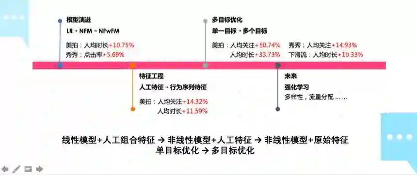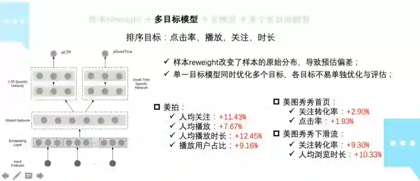 综合多模型和多目标模型的优点,采用多个多目标模型是解决多目标任务的有效手段。在美拍场景下,通过同时优化关注、时长、播放等目标,人均关注提升 12.18%,活跃留存提升 25.67%。