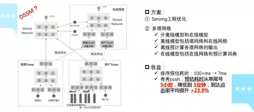 随着模型和特征的复杂度显著增加,在线 inference 的耗时已经无法满足业务的要求。为了解决模型推理效率的问题,一方面我们通过 C++ 重写了模型在线推理服务——MML Serving,并在内存和并发上做了大量优化,使得 QPS 和稳定性有了大幅度提升。另一方面,我们实现了多塔网络的模型框架,通过离线预计算 user 和 feed 子网络的输出,并存到 DB 中,在线通过检索 DB 的方式,避免了实时计算 user 和 feed 子网络的庞大计算量。收益也是很明显,其中排序预估耗时从 100+ms 下降到了 7ms,秀秀社区 push 服务预估耗时从单尾号 5 小时降低到了 3 分钟,到达点击率平均提升 23.9%。