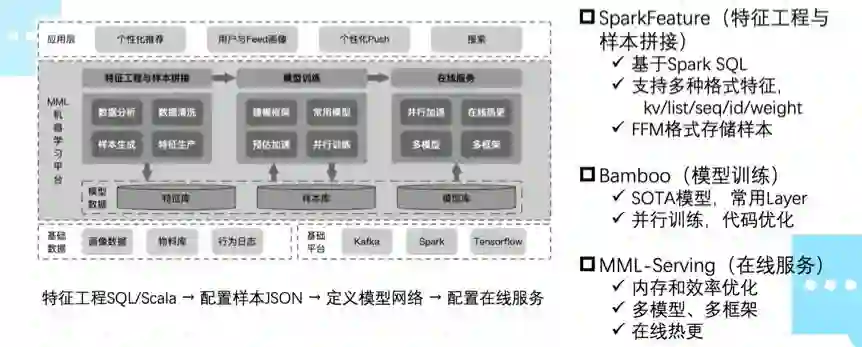 在工具上,我们开发了 MML 机器学习平台,提供从数据分析到模型在线服务的全流程开发及部署支持。基于 Tensorflow,我们内部自研了 Bamboo 建模框架,提供了丰富的 SOTA 模型,常用 Layers 以及其它建模所需的组件,模型离线评估等,让算法工程师专注网络结构的设计。