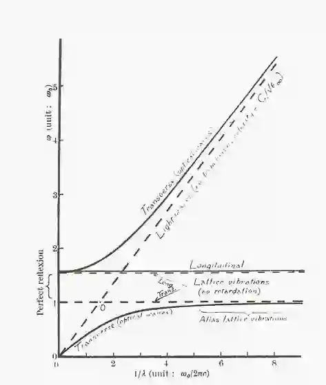光波与晶格振动,参见 Born & Huang 原著。图中两条水平的虚直线表示(上)纵向光学声子LO和(下)横向光学声子TO的色散关系。在这两条线之间不存在极化激元,光波几乎完全被离子晶体反射,这也就是所谓的剩余射线带。斜的虚直线表示光子的色散关系。两条实曲线表示极化激元的色散关系。在横向光学声子TO与光子的色散曲线相交的点附近,光子与声子形成共振,发生强烈的耦合。