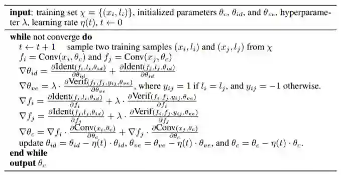 基于这样的 insight,DeepID2 在训练的时候不是以一张图片为单位了,而是以 Image Pair 为单位,每次输入两张图片,为同一人则 Verification Label 为 1,不是同一人则 Label 为 -1,参数更新思路见下面公式(截自 DeepID2 论文):
