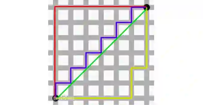 图中红线代表曼哈顿距离,绿色代表欧氏距离,也就是直线距离,而蓝色和黄色代表等价的曼哈顿距离。