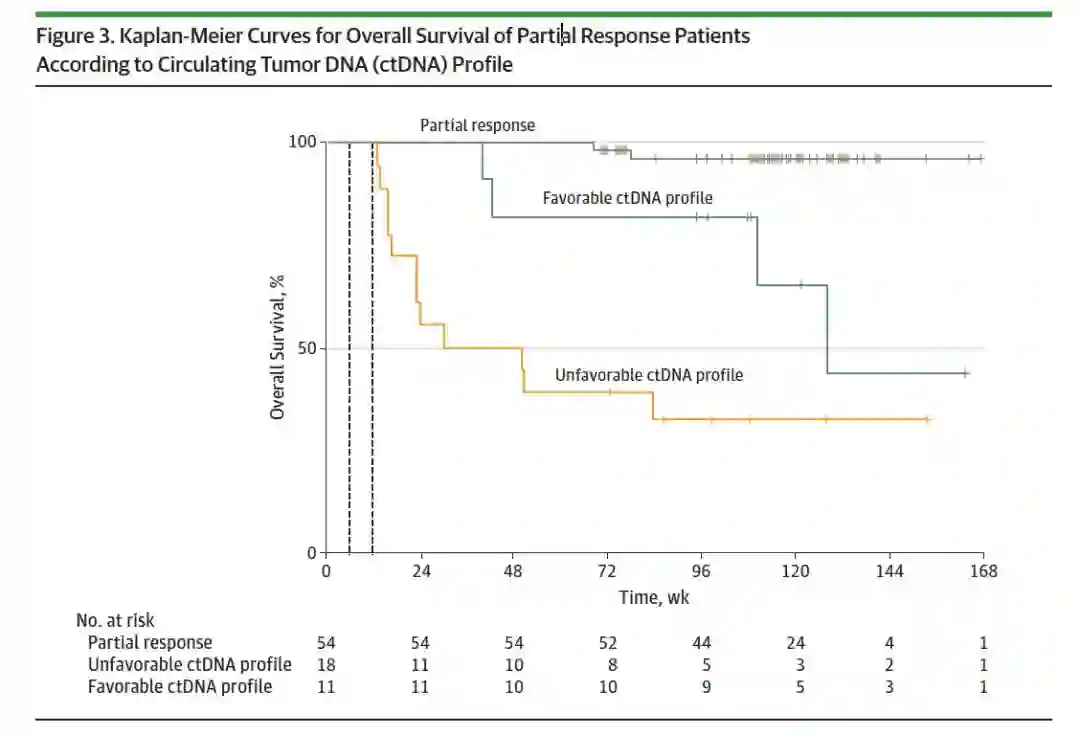 根据第6周的ctDNA变化谱来预估良性和恶性变化患者的总生存,HR为3.9,P=0.02;根据第12周的ctDNA变化谱来预估良性和恶性变化患者的总生存,HR为3.3,P=0.03. 在ctDNA变化谱属于良性的患者中(125例),取得部分患者的患者较疾病进展的患者,总生存更优(HR=0.09;95%CI:0.01-0.80;P<0.001)。取得PR的患者1年生存率为100%,良性和恶性ctDNA变化谱患者1年生存率分别为82%和39%,三组的总生存对比如下图3所示。