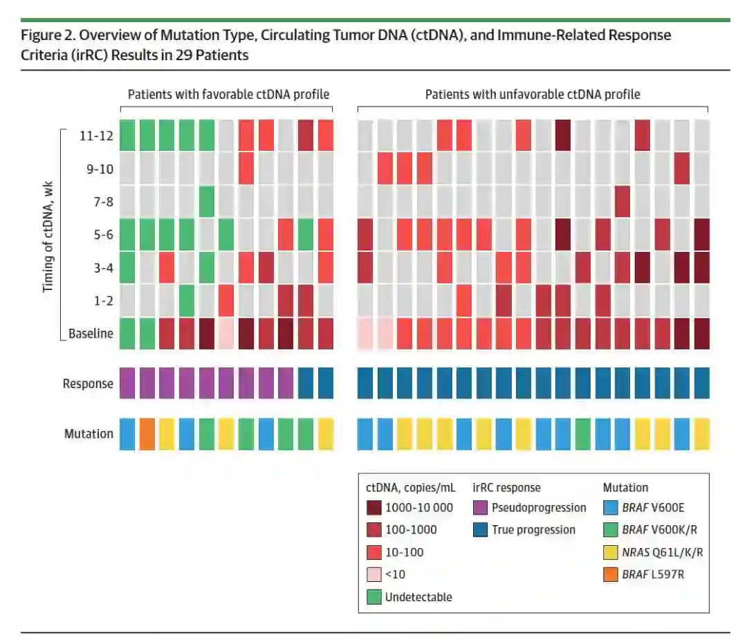 PD-1抑制剂单药或联合ipilimumab已经成为转移性黑色素瘤的标准治疗方案。既往的研究显示,在接受抗PD-1单抗治疗的黑色素瘤患者中,基线或治疗8周内检测不到血浆ctDNA,预示着患者的治疗疗效更好,且预后更佳。假性进展,是指患者在治疗后出现新发病灶或靶病灶体积增大,在接受PD-1单抗治疗的患者中发生率超过10%。要确定患者是否为假性进展,需要后续进行影像学检测进一步确认,目前识别假性进展仍然是临床一大难题,尽管提出了免疫相关疗效评价标准(irRC)。本研究中,作者对接受PD-1单抗治疗的黑色素瘤患者进行基线或治疗早期ctDNA的监测,评估其能否区分免疫治疗的真性或假性进展。