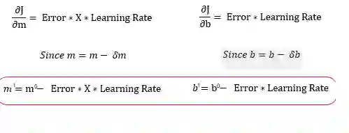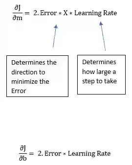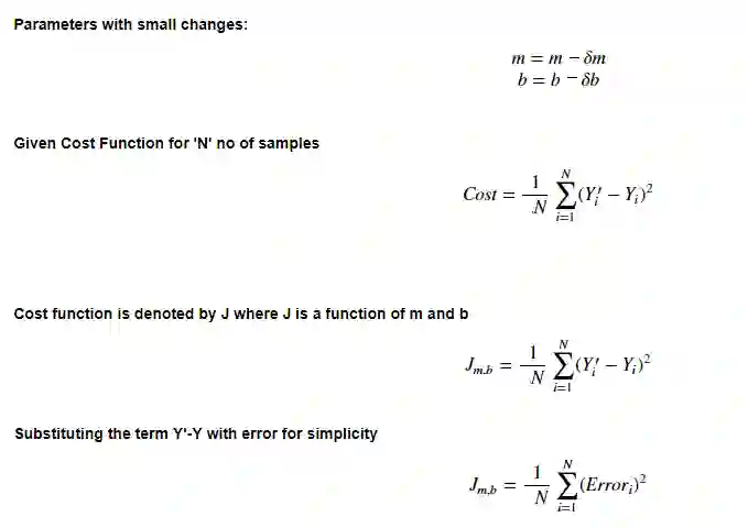 现在,让我们将上面介绍的一切写成数学公式。在等式 y = mX+b 中,m 和 b 是其参数。在训练过程中,它们的值会进行较小的变化。我们将这个小变化表示成δ。参数的值将分别以m=m-δm和 b=b-δb 的方式更新。这里我们的目标是找到y=mx+b 中能使误差最小的 m 和 b 值,即最小化成本函数的值。