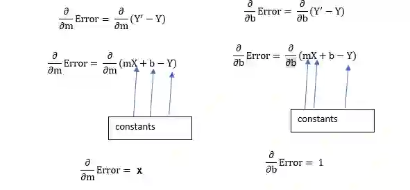 将幂规则和链式法则用于导数,我们可以计算成本函数相对于 m 和 b 的变化方式。这涉及到偏导数的概念,即如果一个函数有两个变量,则寻找该函数相对于一个变量的偏导数的方法是将另一个变量视为常量。用例子解释会更清楚: