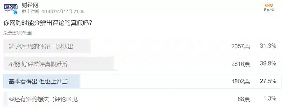 财经网曾经以网购时能否分辨出评论真假为题做过一次调查,6563人参与,有2057人能将水军刷的评论一眼就能认出。2616人表示真假难辨,另有1802人虽然看得出刷评痕迹,但也上了当。