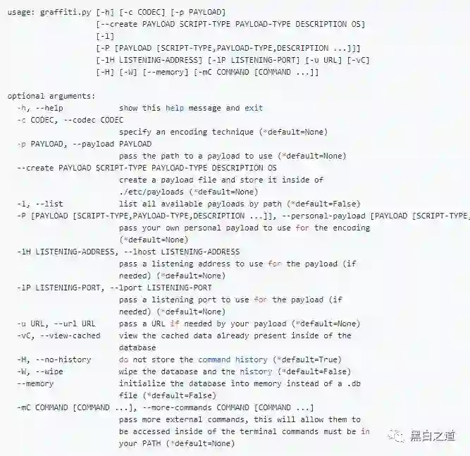 当您需要快速编码的有效负载时,Graffiti还附带命令行参数: