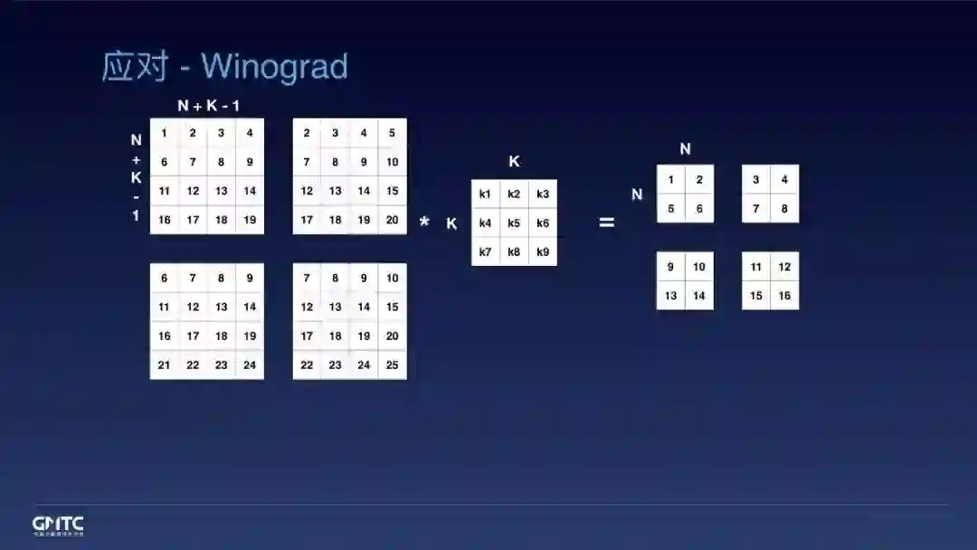 这样,原来矩阵卷积所需要的 9x4 次乘法计算就可以用矩阵点乘的 4x4 次乘法计算代替。只考虑乘法耗时的话,加速了 2.25 倍。示例中, K=3,N=2 ,但实际使用时,可以选择更大的 N 值,获取高的加速倍数,但也要相应消耗更多的内存。