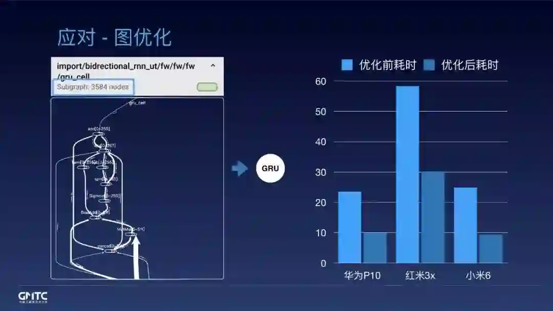 左图是 RNN-GRU cell 在 TensorBoard 中的可视化描述。它足足包含了 3584 个节点,而每一个节点都代表了一定的数据读写或运算,累积起来的总量非常大。然而,所有这些节点可以打包使用一个大颗粒的算子来替代。这不仅大幅降低了部署模型的大小,还可以在大颗粒算子的实现中聚合大量的计算,避免不必要的数据读写。