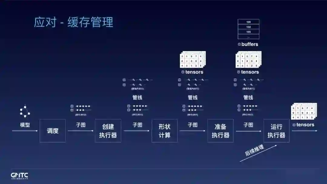 在创建完执行器之后,子图和管线已经就绪。下来,需要计算出所有 tensor 的形状,在相应的后端上完成内存的分配。而后,在准备执行器时,再为所有的执行器预先在后端上申请好必要的 buffer。运行结束后,返回 tensor 即可。