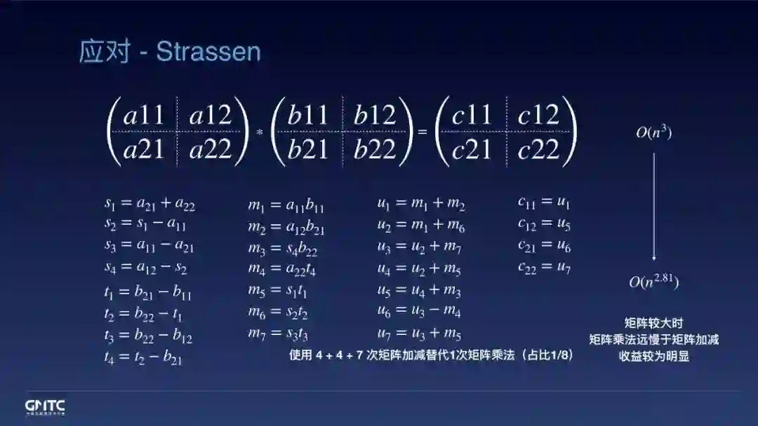 这里可以引入中间小矩阵, s1 ~ s4、t1 ~ t4、m1 ~ m7、u1 ~ u7 。其中,只有 m1 ~ m7 包含小矩阵乘法,一共 7 次小矩阵乘法运算。而其他的,只包含小矩阵的加减法。也就是说,通过 4 + 4 + 7 次小矩阵加减法,替代了一次小矩阵乘法。