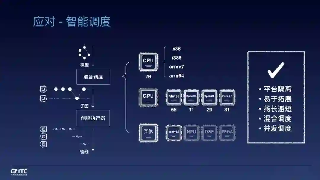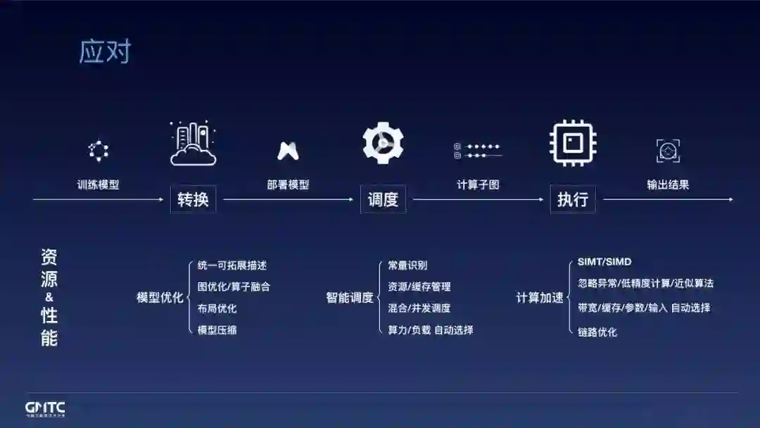一款优秀的端侧推理引擎,就需要在这样碎片化的环境下,利用设备有限的资源,尽可能发挥出设备的性能。为此,也需要在转换、调度、执行上加入相应的优化策略。下文,会就其中的部分展开说明。