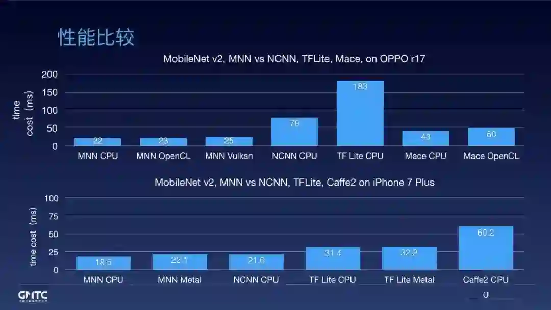 如图, MNN 的性能在 CPU 和 GPU 上都有一定的优势。