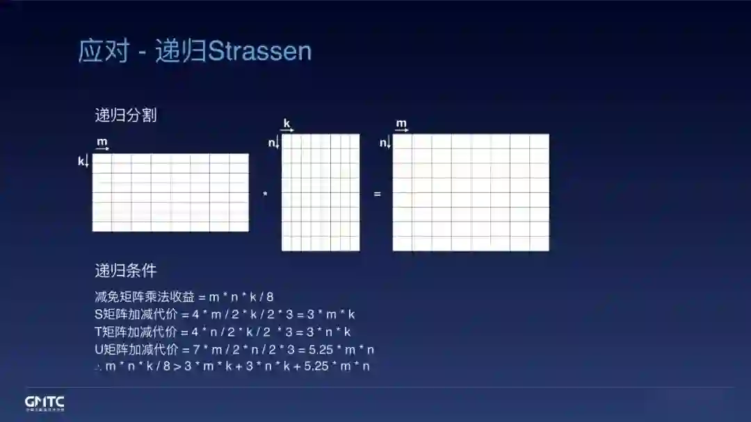 在 MNN 中,我们会递归使用 Strassen 。也就是说,递归拆分矩阵。在矩阵足够大时,继续拆分;在矩阵不够大时,使用普通的矩阵算法。这里使用减免的矩阵乘法开销作为收益,使用小矩阵 s 、小矩阵 t 、小矩阵 u 矩阵的加减法开销之和作为代价,收益大于代价时,就可以考虑使用 Strassen 算法。