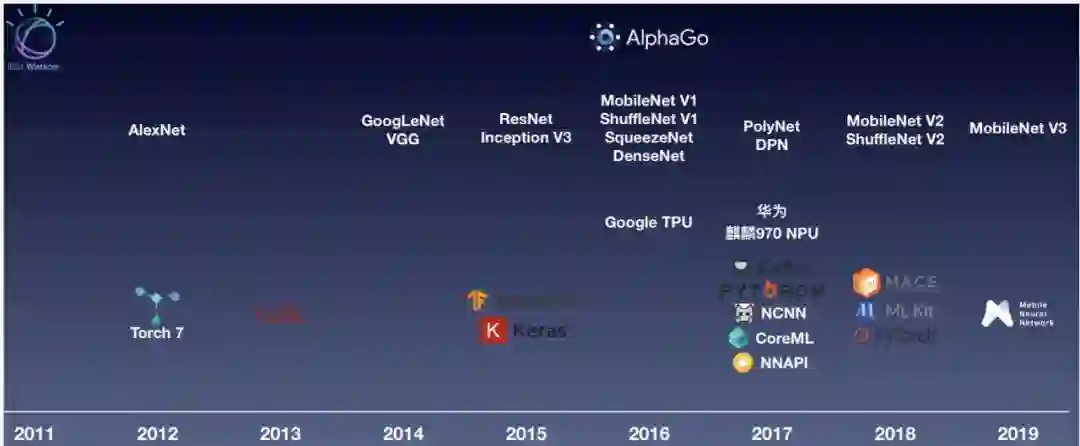 人工智能从 2006 年开始,迎来了第三次浪潮。随着 AlphaGo 在 2016 年、 2017 年先后战胜李世石和柯洁,人工智能彻底进入了公众的视野。人工智能大热的背后,是大数据的积累,是深度学习的发展,也是设备算力的提升。与此同时,深度学习的框架也在不断演进 —— 从 Torch、Caffe 到 TensorFlow、PyTorch ,再到更面向移动端的 CoreML、NNAPI、NCNN、MACE 等。淘宝的深度学习推理引擎 MNN 也于 2019 年 5 月宣布开源。