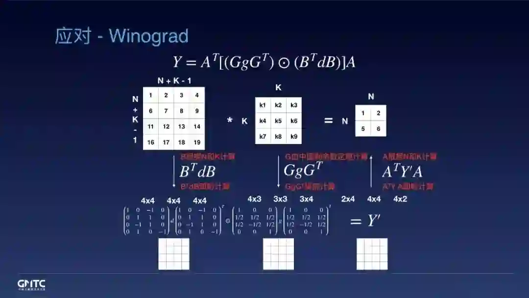 再套用 Winograd 的公式,将矩阵间的卷积运算转换为矩阵点乘运算。在这个过程中,除了矩阵点乘外,还引入三个矩阵转换,分别是输入矩阵 d 、权重矩阵 g 和结果矩阵 Y’ 的转换。其中,权重转换时, G 矩阵可以利用中国剩余数定理计算, GgGT 就可以在准备执行器时提前计算;输入转换和输出转换时用到的 A 和 B 矩阵需要根据 N 和 K 计算,我们在代码中内置了几种优化后的组合,所以实际计算时,这两个转换并不需要经过复杂的矩阵乘法。