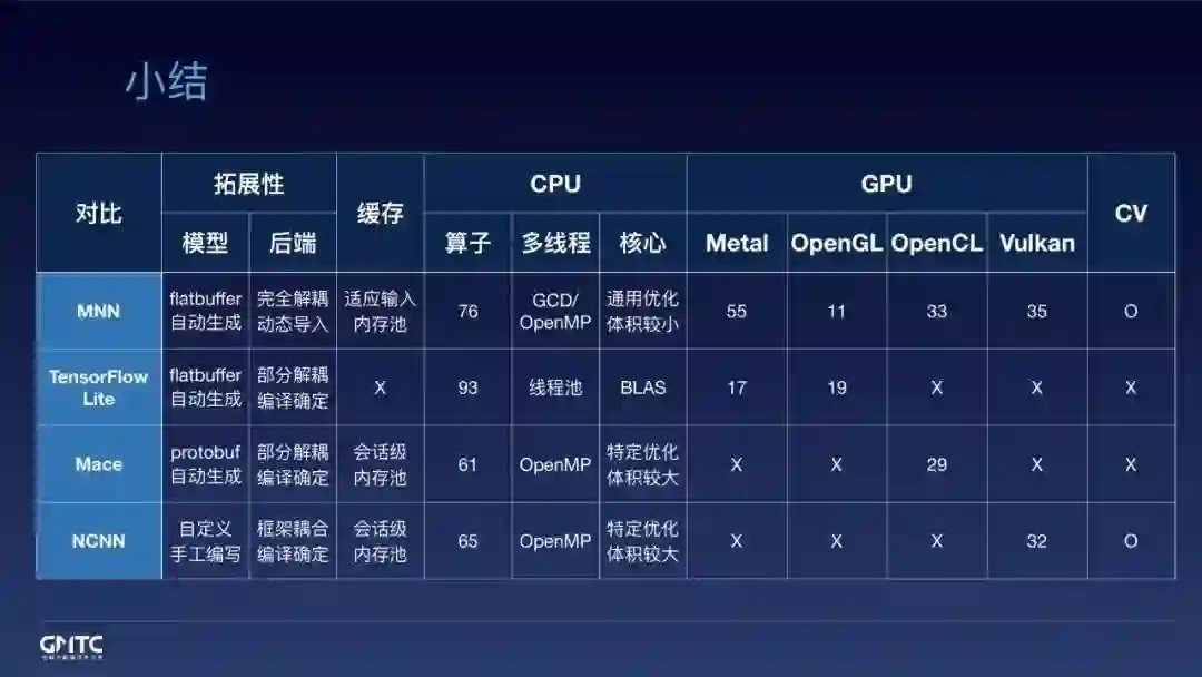 目前, MNN 在 CPU 上实现了 76 个算子, Metal 上有 55 个, OpenGL 覆盖了基础的 CNN 网络, OpenCL 和 Vulkan 分别有 29 和 31 个。