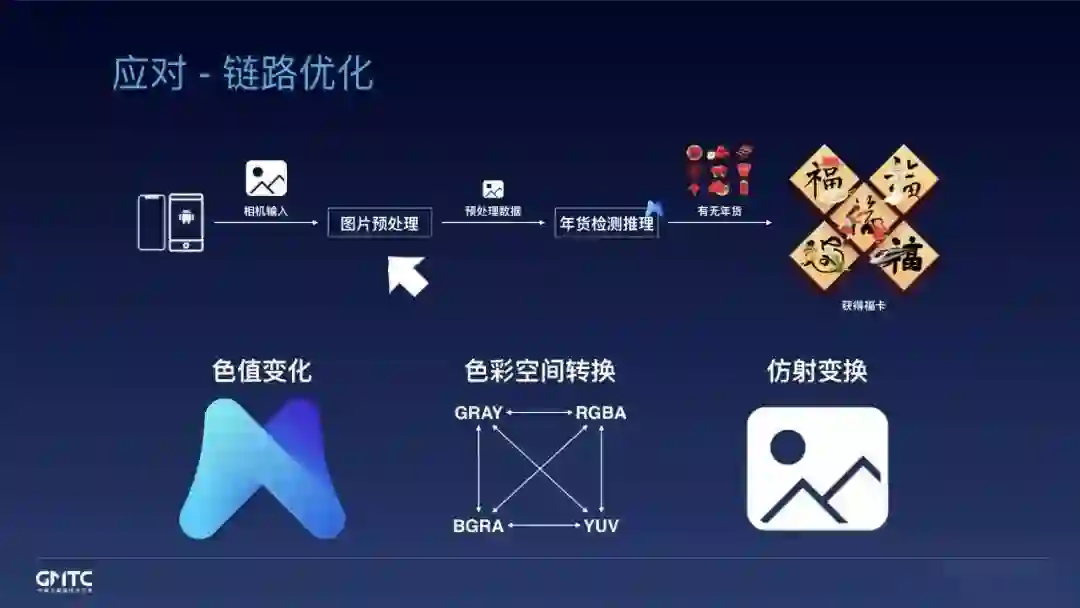 链路优化可以举一个 19 年春节淘宝扫年货的例子。在获得手机相机输入后,每一帧的图像首先需要经过一次预处理,将图片缩放到年货检测模型的输入大小上,然而再经过推理,判定图像有没有年货,如果有,就发放相关权益。这个过程中,图片预处理的耗时也不容忽视。降低这个耗时,就可以帮助我们提升帧率,从而改进用户体验。为此,我们引入了一个轻量级的 2D 图片处理库,可以高效地完成色值变化、色彩空间的转换或者仿射变换等。这样, MNN 的用户就不再需要为图片处理引入 libyuv 或者 opencv 了。