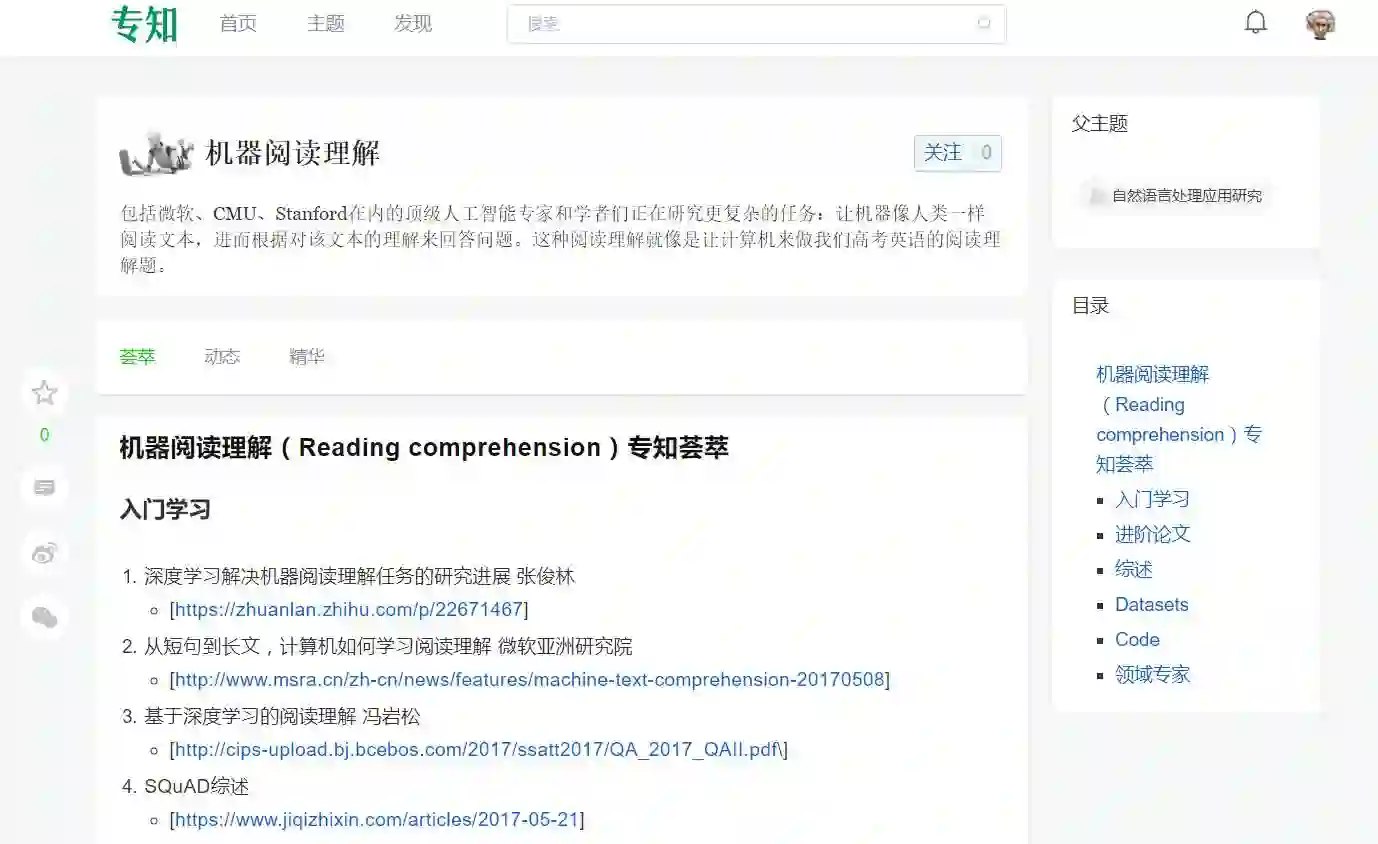 【导读】主题荟萃知识是专知的核心功能之一,为用户提供AI领域系统性的知识学习服务。主题荟萃为用户提供全网关于该主题的精华(Awesome)知识资料收录整理,使得AI从业者便捷学习和解决工作问题!在专知人工智能主题知识树基础上,主题荟萃由专业人工编辑和算法工具辅助协作完成,并保持动态更新!另外欢迎对此创作主题荟萃感兴趣的同学,请加入我们专知AI创作者计划,共创共赢! 今天专知为大家呈送第二十二篇专知主题荟萃-机器阅读理解(Reading Comprehension)知识资料大全集荟萃 (入门/进阶/综述/视频/代码/专家等),请大家查看!专知访问www.zhuanzhi.ai, 或关注微信公众号后台回复" 专知"进入专知,搜索主题“机器阅读理解”查看。此外,我们也提供该文网页桌面手机端(www.zhuanzhi.ai)完整访问,可直接点击访问收录链接地址,以及pdf版下载链接,请文章末尾查看!此为初始版本,请大家指正补充,欢迎在后台留言!欢迎大家分享转发~