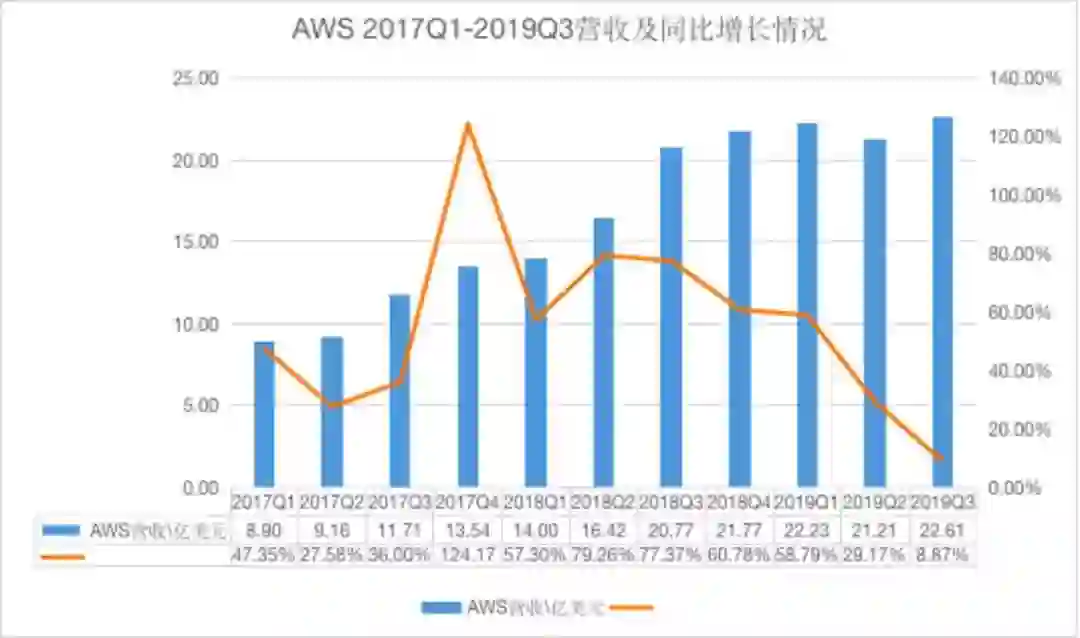 另一边,AWS虽然是国际上的云计算霸主,但从AWS近3年的营业利润数据来看,其增速从2018年Q2开始已经有了连续5个季度的下滑。