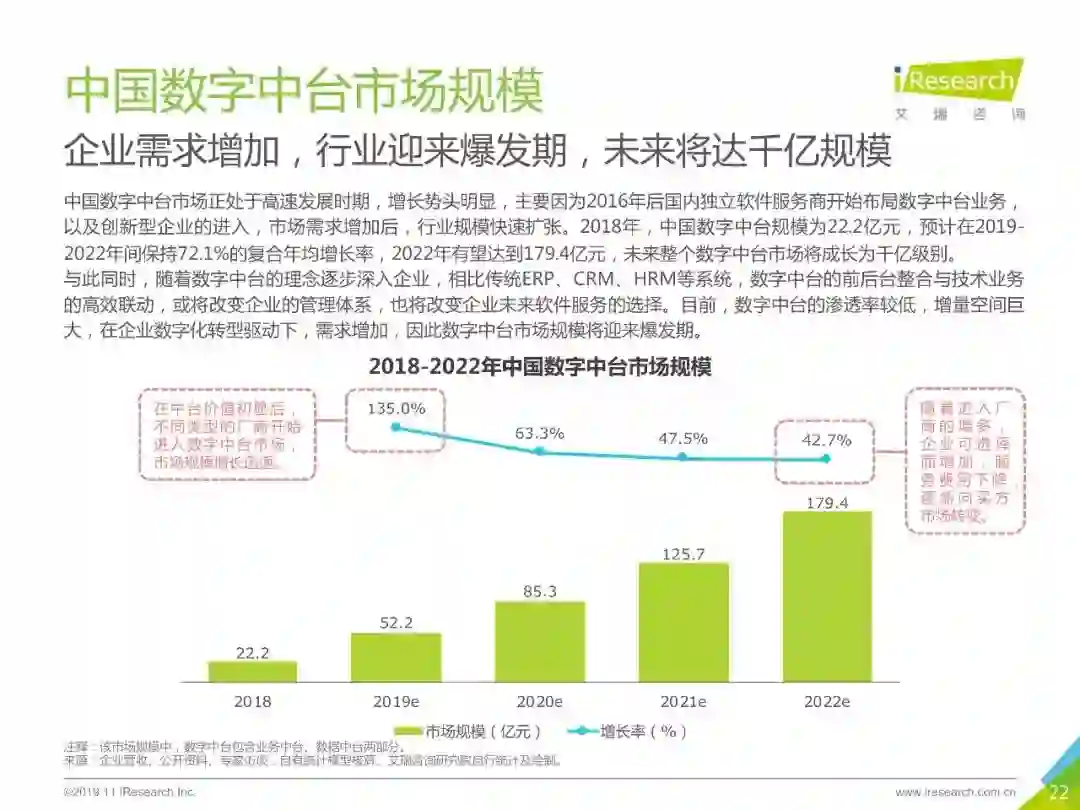 报告显示,中国数字中台市场增长势头明显,行业规模快速扩张。目前服务厂商以解决方案项目制为主。2018年,中国数字中台规模为22.2亿元,并在2019-2022年间保持72.1%的复合年均增长率,2022年将达到179.4亿元,未来将成长为千亿级别市场。