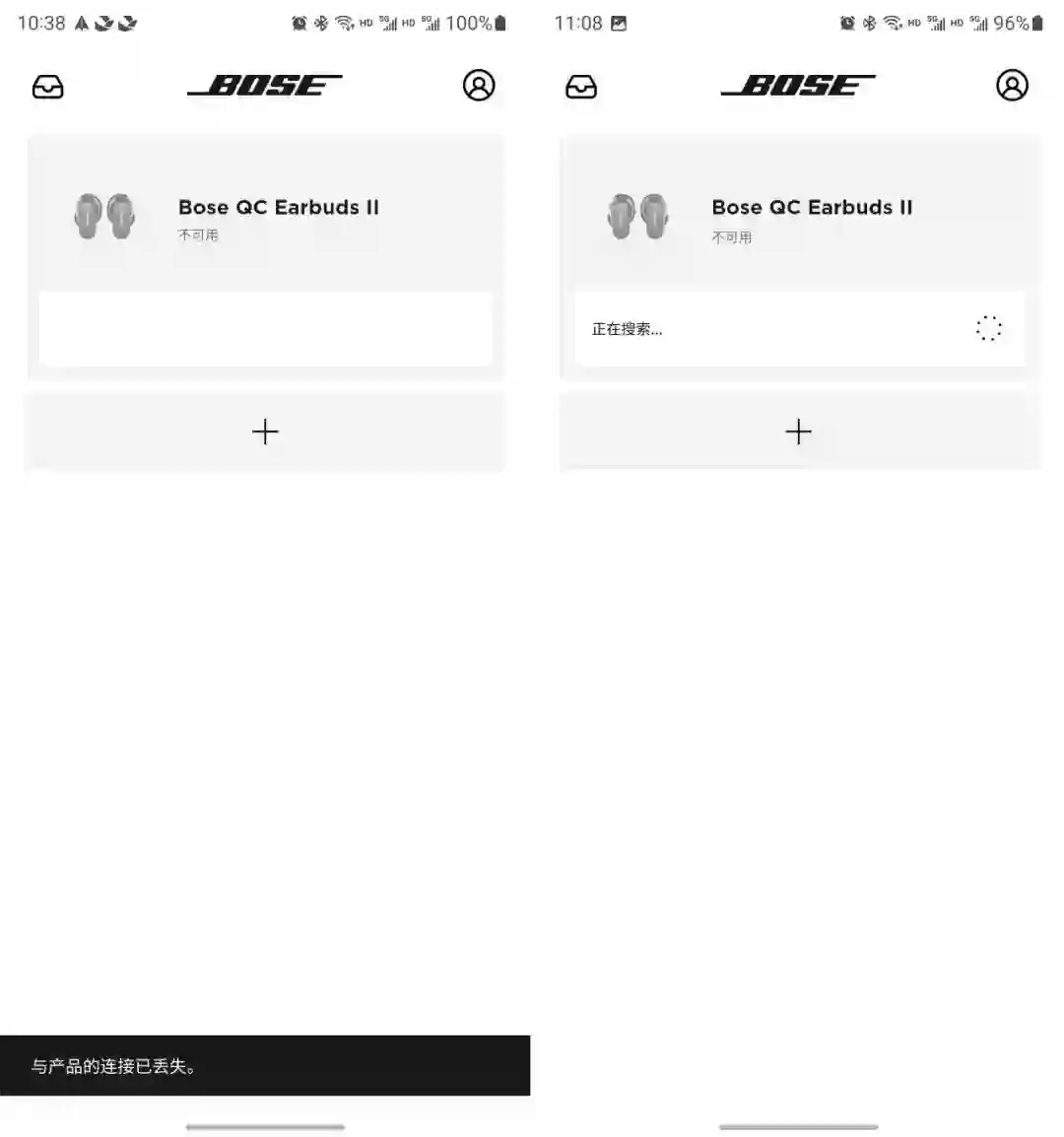 以配合三星 Galaxy S22 Ultra 使用为例,在耳机已经连接或正在使用的情况下,打开 BOSE 配套应用时它会先提示你「设备连接已丢失」,然后开始转圈、搜索,最后将已连接设备加载出来。甚至在保持应用打开,但手机锁屏一段时间重新解锁后,这个流程也会当着你的面重复一次……