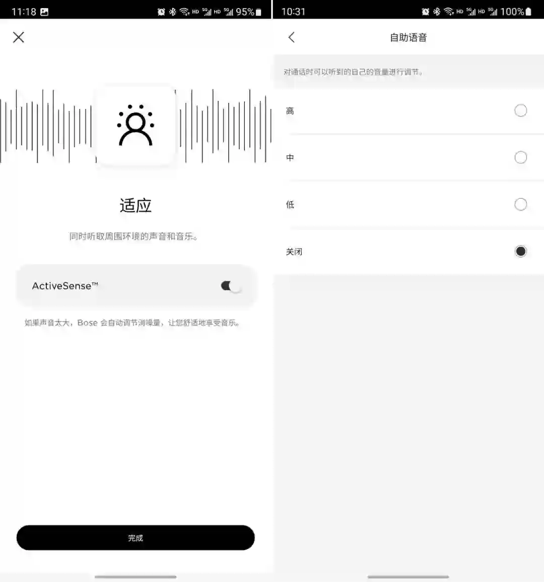 针对这个问题,BOSE 在配套应用中提供了一个名为「自助语音」音量调节的功能,提供关闭、低、中、高四档设置来对通话过程中自己的声音反馈效果进行调节。实际体验下来关闭和高两档之间有差别,但感知并不明显,关闭状态下能够听到的声音或许大部分来都源于骨传导,而将「自助语音」音量调到高之后,则能听出自己的声音里多了一点麦克风收音的塑料感。