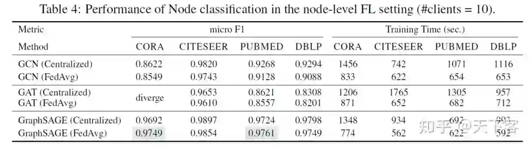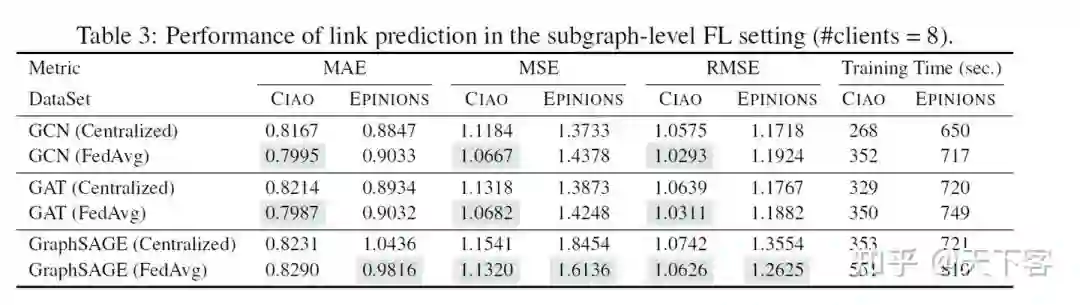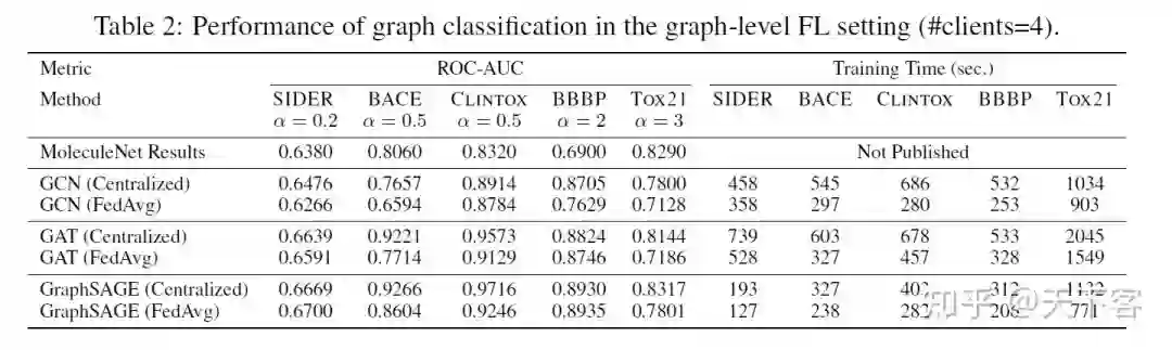 下图展示了通过最广泛使用的 FL 算法 FedAvg 训练的几个流行的 GNN 模型的实验结果,以检验 FedGraphNN 的效果。调参后,在表 2、表 3 和表 4 中展示了效果和运行时间。