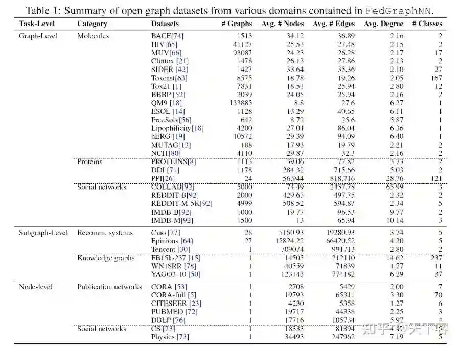 联邦学习尽管最近在视觉和语言领域取得了进展,但还没有合适的平台用于 GNNs 的 FL。基于此本文提出 FedGraphNN,an open FL benchmark system。FedGraphNN 基于图联邦学习,包含了来自不同领域的数据集、被广泛应用的 GNN 模型和 FL 算法,并有安全和高效的系统支持。FedGraphNN 收集预处理了来自 7 个领域的 36 个数据集。