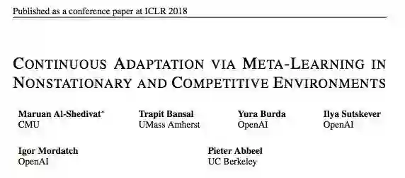 在非平稳环境中不断学习和适应有限经验的能力是计算机通往真正的人工智能的重要里程碑。此文提出了“learning to learn”框架的持续性适应问题。通过设计一种基于梯度的元学习算法来对动态变化和对抗性场景的进行适应。此外,文中还设计了一种基于多智能体(multi-agent)的竞争环境:RoboSumo,并定义了适应性迭代游戏,用于从不同方面测试系统的持续适应性能。实验证明,元学习比在few-shot状态下的反应基线具有更强的适应能力,且适应于进行multi-agent学习和竞争。