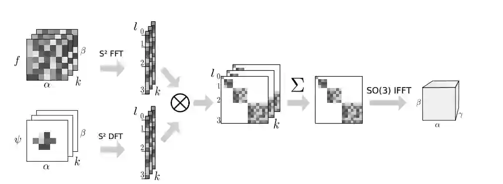 这篇论文中介绍了如何构建球形CNN的模块,提出了利用广义傅里叶变换(FFT)进行快速群卷积(互相关)的操作。通过傅里叶变换来实现球形CNN的示意图如下所示: