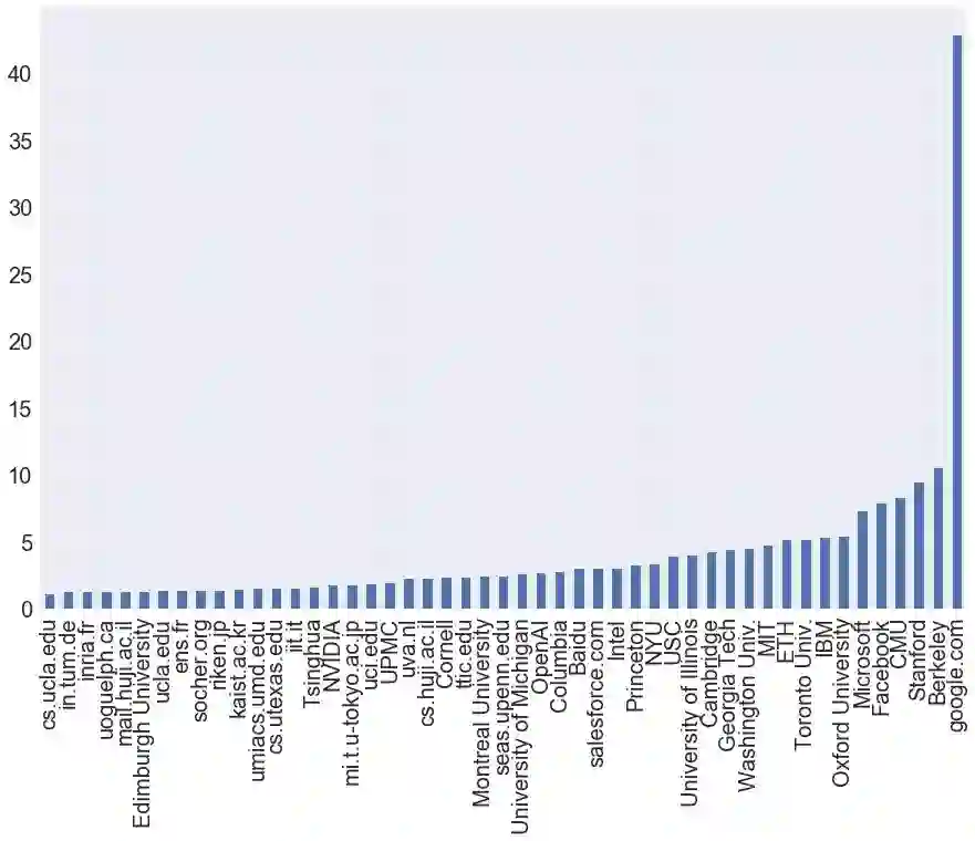 接收论文数量最多的机构:谷歌第一、伯克利第二、斯坦福第三