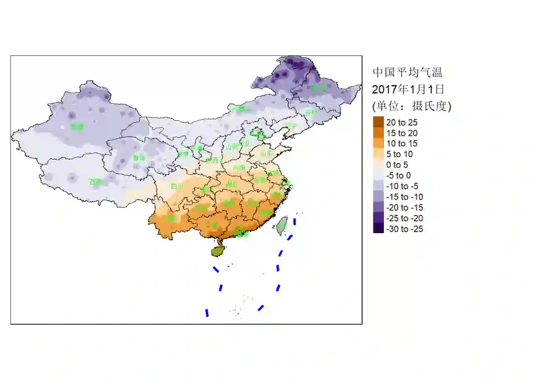 7 title="中国平均气温\n2017年1月1日 \n(单位:摄氏度)") +
