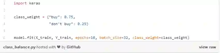 我们创建了一本字典,基本上说我们的「购买」类应该占了损失函数重量的 75%,因为更重要的是「不购买」类,我们相应地设置为 25%。当然,这些值可以很容易地进行调整,以找到应用场景中的最佳设置。如果其中一个类的样本明显多于另一个类,我们也可以使用这种方法进行平衡。我们可以尝试使用权重平衡法来使所有的类都对我们的损失函数产生一样大的影响,而不必花费时间和资源去收集更多的少数类实例。