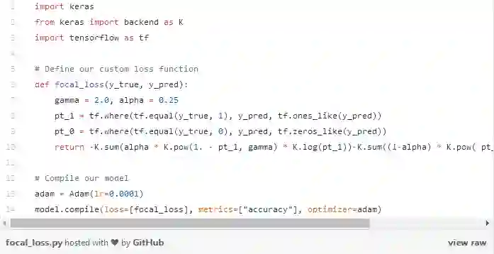 这正是焦距损失法可以解决的问题!焦距损失不是对所有训练实例赋予同等的权重,而是对分类良好的实例进行降权。这样做的直接效果是将更多的训练重点放在那些难以分类的数据上!在存在数据不平衡的实际环境中,大多数类将很快被很好地分类,因为我们有更多的训练样本数据。因此,为了保证我们对少数类的训练也达到较高的准确度,我们可以利用焦距损失在训练中给那些少数类更大的相对权重。焦距损失在 Keras 中可以很容易地实现为自定义损失函数: