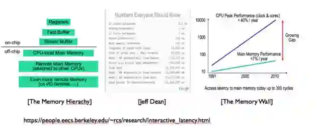 近些年CPU、GPU等计算硬件的效率提升速度远高于主存性能的提升速度,所以计算和存储上的性能差距在不断扩大,形成了“存储墙”(Memory Wall),因此在很多问题上,存储优化更为重要。在存储方面,从CPU的寄存器到L1、L2等高速缓存,再到CPU本地内存,再到其他CPU内存,还有外存等有着复杂的存储结构和不同的存储硬件,访问效率也有着量级的差距。Jeff Dean建议编程人员牢记不同存储硬件的性能数据。