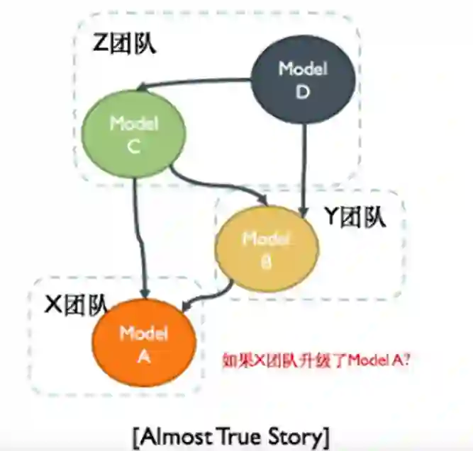 在大公司中经常发生的情况是模型之间的依赖,在解决某个业务问题时,建立了机器学习模型B,为了图快,依赖了其他团队模型A的输出,但是如果依赖的团队升级了模型A,那么对于B而言将会是灾难性的。