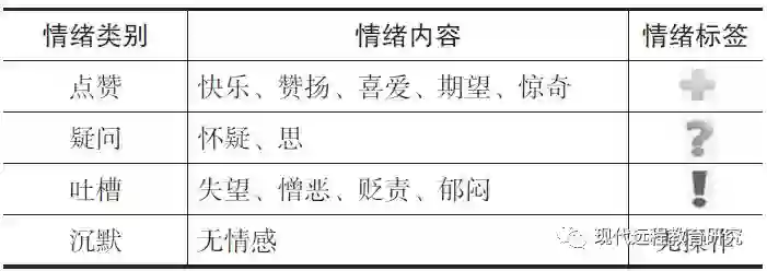 情绪标签设置主要参考徐琳宏等人提出的情感分类树,并根据在线课程学习特点对其进行修订。徐琳宏等人将人类情感划分为乐(快乐、安心)、好(赞扬、相信、尊敬、喜爱、感动、期望)、怒(愤怒)、哀(悲哀、失望、疚、思)、惊(惊奇)、恶(羞、郁闷、贬责、憎恶、妒忌、怀疑)、惧(慌、恐惧)、无情感等8种类别(徐琳宏等,2008)。网络情境中学习者的学习情绪不同于一般的人类情感,其情绪活动大致可分为点赞、疑问、吐槽、沉默四类。其中,“点赞”对应情感分类树中“乐”“好”和“惊”的部分内容;“疑问”对应情感分类树中“哀”和“恶”的部分内容;“吐槽”对应情感分类树中“哀”“恶”和“怒”的部分内容;“沉默”对应情感分类树中“无情感”的内容。为便于实际操作,本研究对学习者学习情绪进行了可视化设计,通过不同的情绪标签图标来表征其情绪内容,如表5所示。