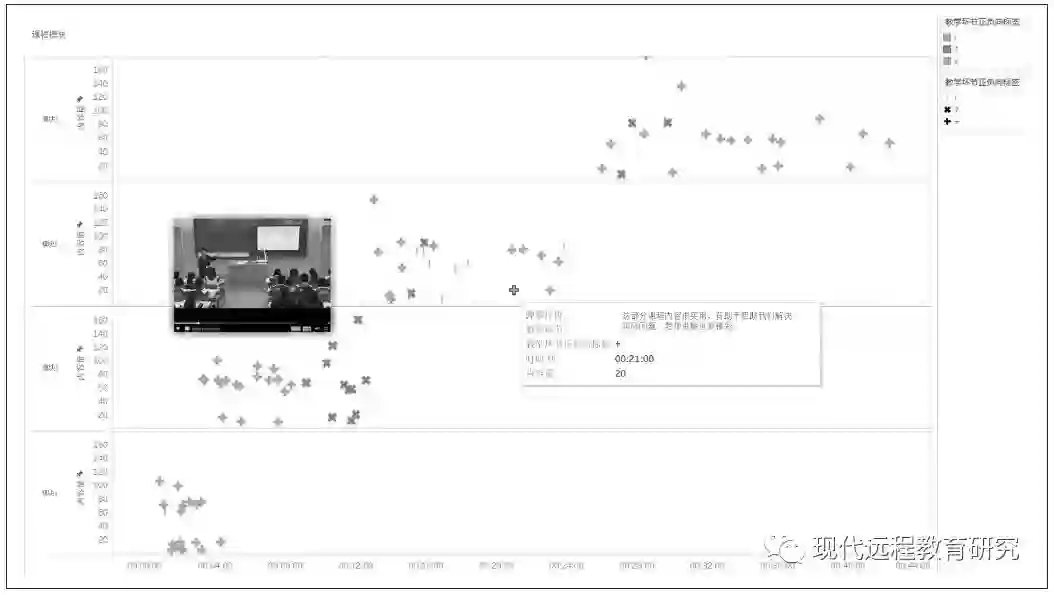 在线课程学习平台是以视频时间轴为线索记录相对应的情绪标签标注信息。如果对情绪标签标注的数据进行整理与统计,就可以得出一个十分详细的时间-标注信息统计视图。根据该视图就能很清晰地发现在线课程内容质量的设计问题或盲区。基于此,本研究采用二维战略坐标仪表盘来分析与呈现在线课程质量过程感知分析结果,如图6所示。其中,横坐标为在线课程内容视频的播放时间,纵坐标为情绪标签在不同内容模块上的标注频次。坐标仪表盘中,不同颜色的标注点分别代表不同情绪标签的标注信息。绿色标注点代表点赞,橙色标注点代表疑问,红色标注点代表吐槽。需要说明的是,每一个标注点都是可交互的,与其所标注的特定的在线课程内容相关联。在实际操作中,教师或课程开发者主要通过直接点击标注点来查看或诊断该段内容的设计质量。当教师点击查看某一标注点时,系统会自动呈现并播放与其标注相关联的课程内容信息,并同时呈现相应的弹幕文本评论。为研究方便,本研究将查看视频内容的播放时间设定为2分钟(前后各1分钟)。相对应的,在弹幕列表中会呈现该段内容的文本评论信息。