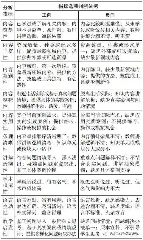 表3 在线课程内容质量结果感知指标选项判断依据