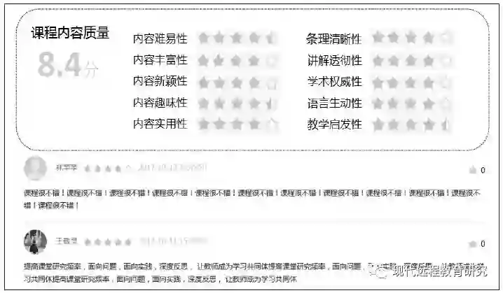 相对于前两种分析方法,学习者调查分析更能客观地反映在线课程的内容质量,成为许多培训机构广泛采用的分析方法。其最典型的实践就是学习者满意度调查。但由于以往实践多以小规模培训为主,样本比较小,加之一些学员不规范参与,导致从学习者角度反馈得到的课程内容质量评价数据误差很大,有时甚至会达到难以“容忍”的程度。可喜的是,近年来随着MOOC的兴起以及“国培计划”等大型培训项目驱动,大规模在线培训已成为“常态”。大规模在线培训的“数量优势”能在很大程度上减少或“淹没”由部分学员不规范参与而造成的样本误差,使得整体上仍能得到较为准确的分析结果。目前,已有一些实践探索,如“好知网”从学习者整体感知视角(很差、较差、还行、推荐、力荐)设计了课程质量分析方法,可以对每门课的总体质量进行调查。“MOOC学院”从学习者多重感知视角(知识点、教师参与、趣味性、课程设计、难度)设计了课程质量分析方法,可以对每门课的整体质量进行价值判断。但是总体而言,这种以满意度或质量等级判断为主的学习者调查方式,其评价颗粒度还比较大,多数研究以整个课程内容为观测点,很难有针对性地发现课程设计中存在的问题。
