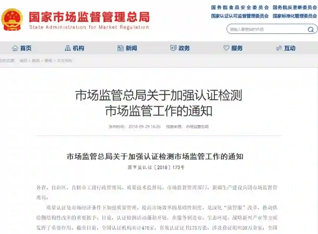 国家市场监管总局于2018年9月29日发布《关于加强认证检测市场监管工作的通知》