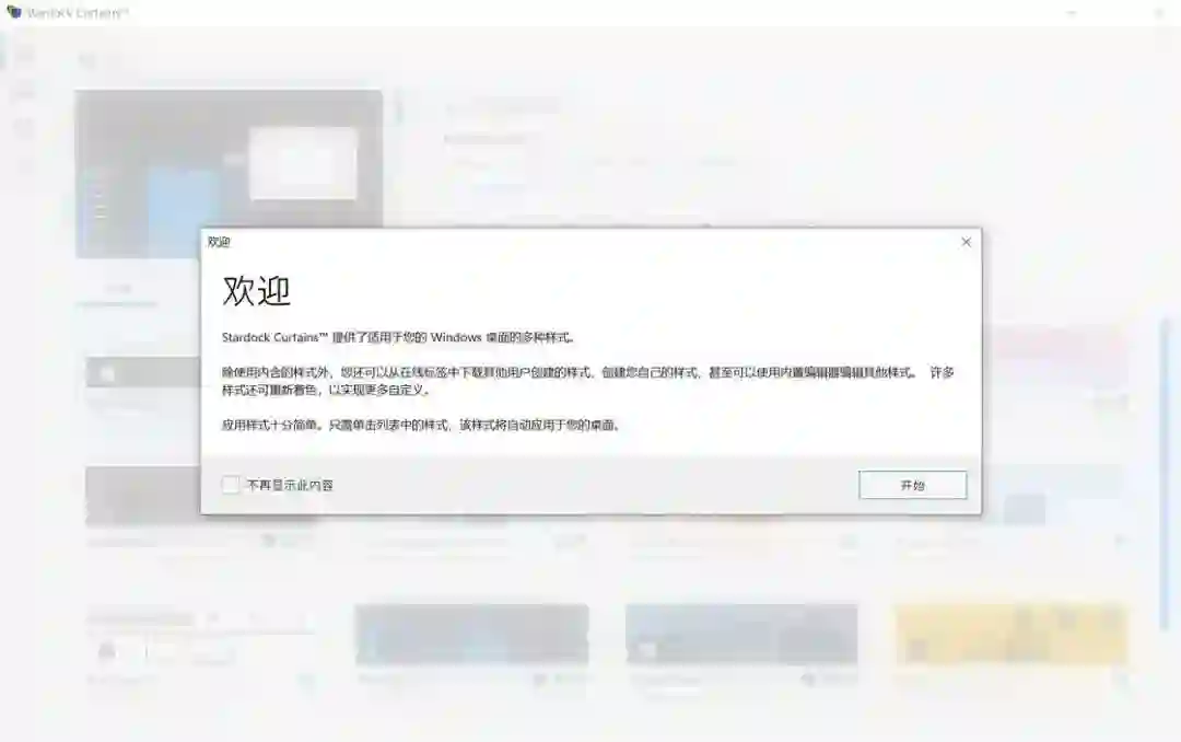 在选定一个外观后,软件会提示你关闭不必要的应用程序或者更换自带的壁纸,以求一次性彻底更换完成: